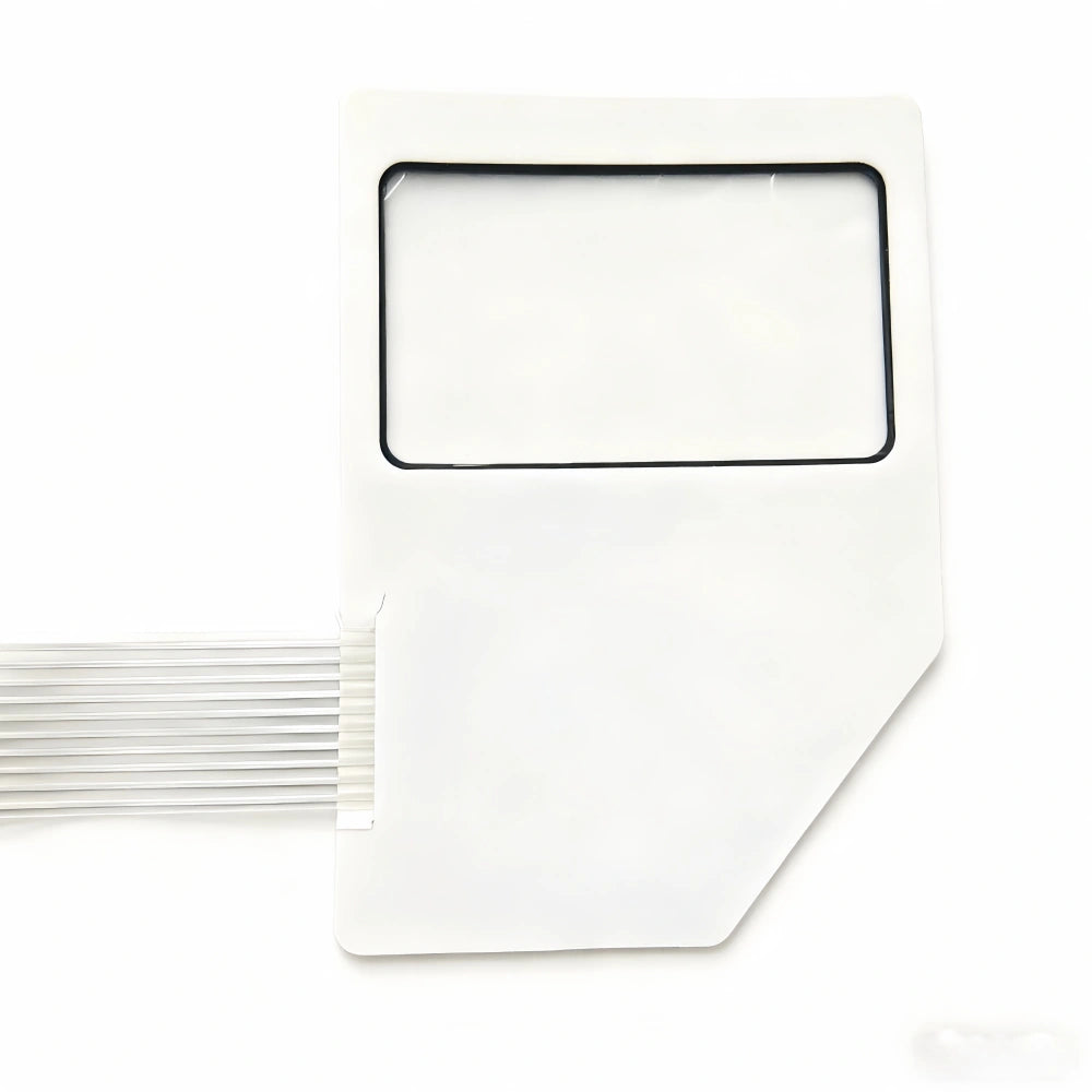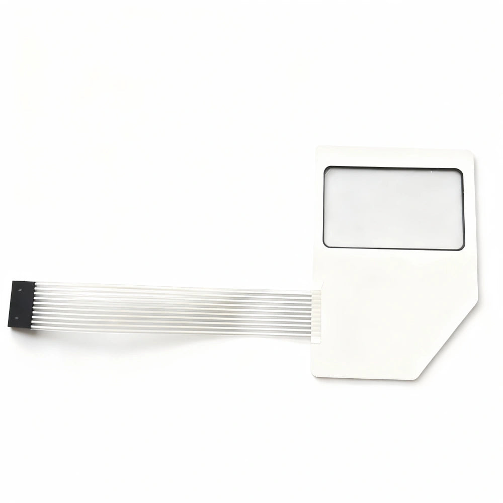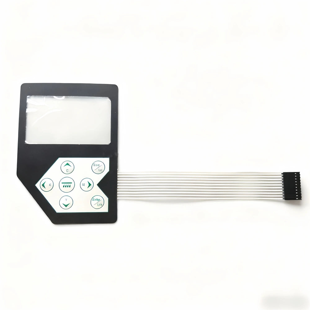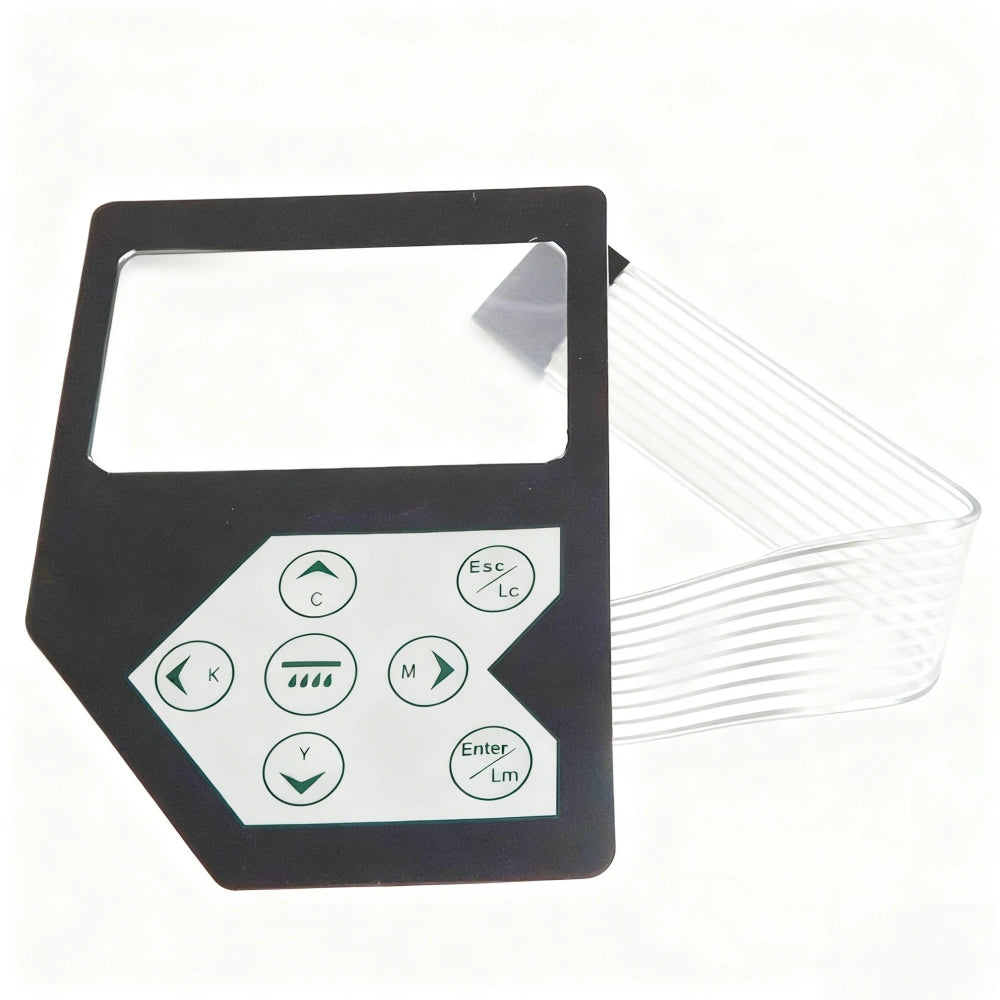 This membrane-style ink pressure control panel is designed for use in wide-format printing systems. It features a transparent viewing window and a 7-button layout that allows users to manage ink pressurization, cleaning cycles, navigation, and more. The panel connects via flat ribbon cable and is easy to install as a replacement part.