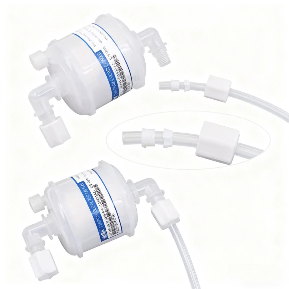 Its curved (L-type) inlet/outlet design saves space during installation, while the integrated adapter ensures secure and leak-free connection with 6×4mm ink tubes. The filter housing is made of chemical-resistant materials and built via thermal welding to prevent adhesive-related contamination. Ideal for use as a primary ink line filter in systems requiring stable flow and high clarity.