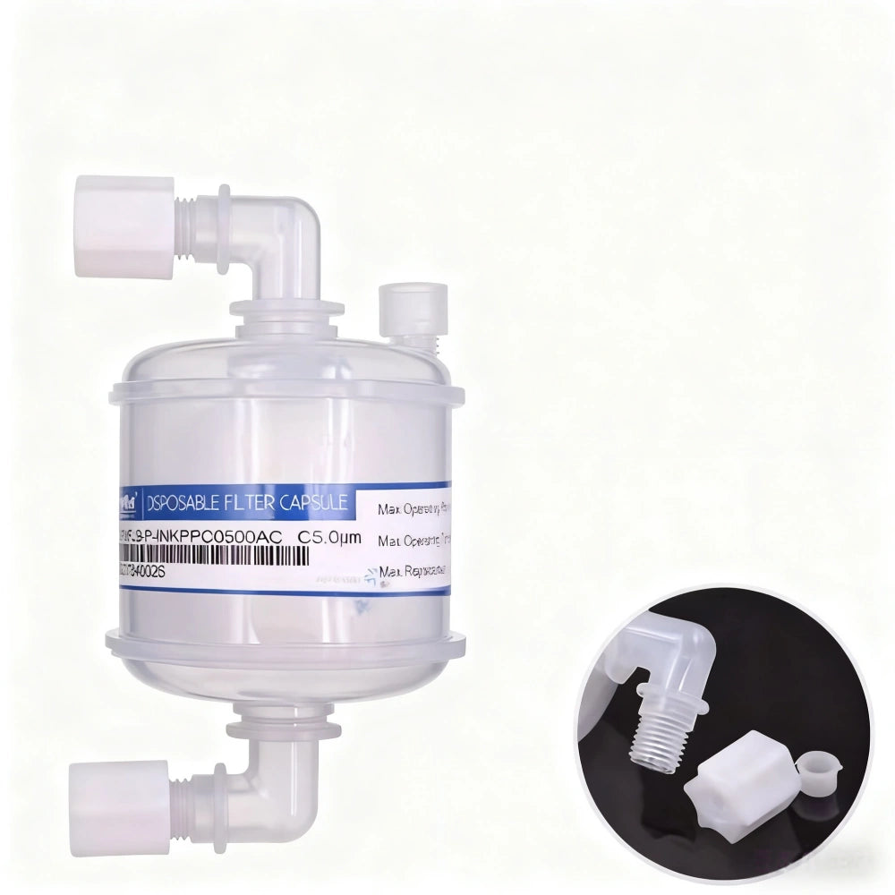 The Cobetter DIPMF J9-P-INKPPC0500AC is a high-efficiency capsule-style main ink filter with elbow connectors, specially designed for industrial digital inkjet and coding printers. With a filtration precision of 5μm, it effectively removes micro-particles and gel-like residues from UV, solvent, or pigment inks before they reach the printhead.