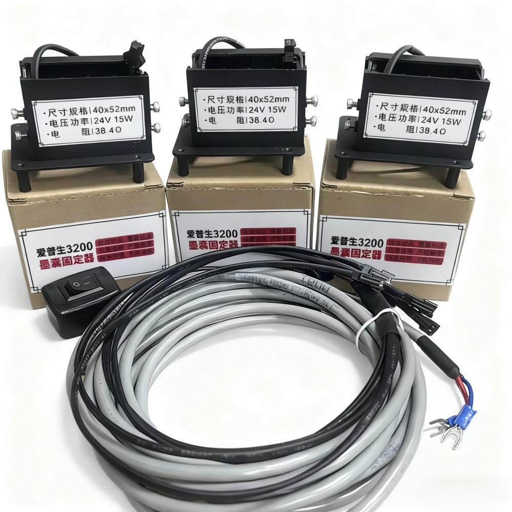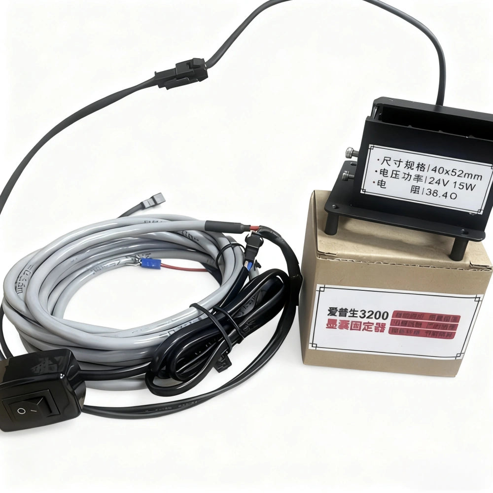Connect the heating holder to a 24V power supply. Fix the damper securely using the provided screws. Keep the power off during installation, and confirm the correct polarity of the power cable. Recommended for Epson 4720 / i1600 / i3200 printheads in UV or solvent printers.