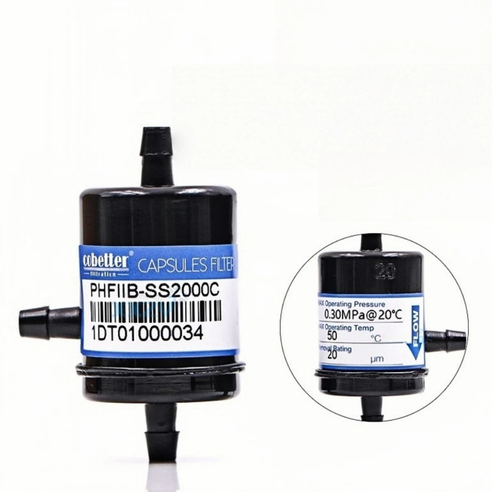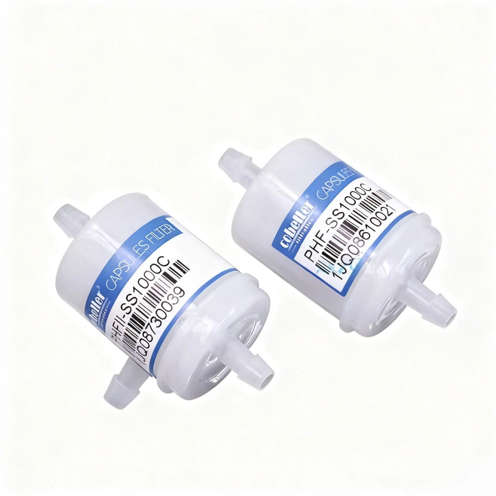 Inline capsule filters for wide-format printers and ink supply systems. The series covers two-way and three-way structures with size codes from 500C to 2000C. Typical filtration ratings available: 5 / 10 / 15 / 20 µm (default commonly 10 µm). Suitable for UV, eco-solvent and water-based workflows.