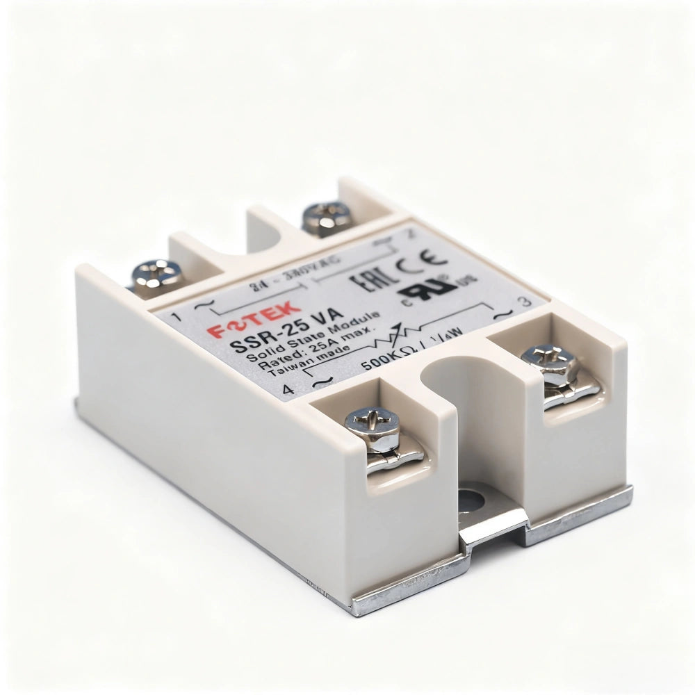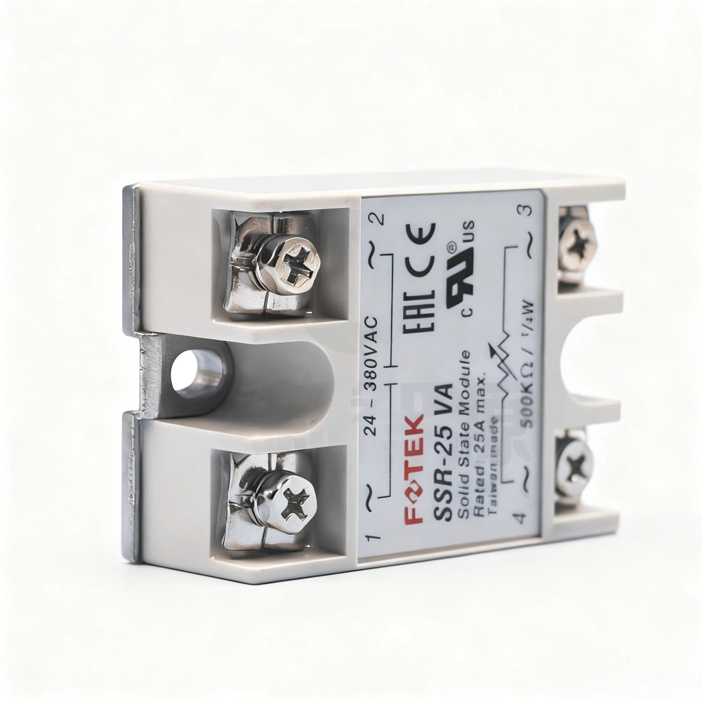 Manufactured in Taiwan and certified with CE, EAC, and UL standards, the SSR-25VA features fast response time, high durability, and zero-contact wear. It is widely used in temperature control circuits, heater switching, and main board voltage regulation in industrial printing machinery.
